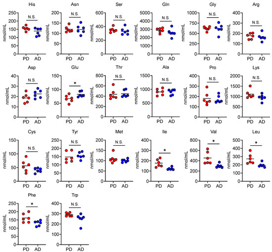 An amino acid-based diet alters plasma amino acid levels. Plasma levels of each amino acid in the mice fed each diet (PD: regular purified diet, AD: amino acid-based purified diet) for 2 weeks (n = 6 in each group). Each dot represents an individual mouse, and horizontal bars indicate mean values. Statistical significance was assessed using the unpaired Welch’s t-test. * p < 0.05; N.S., not significant.
