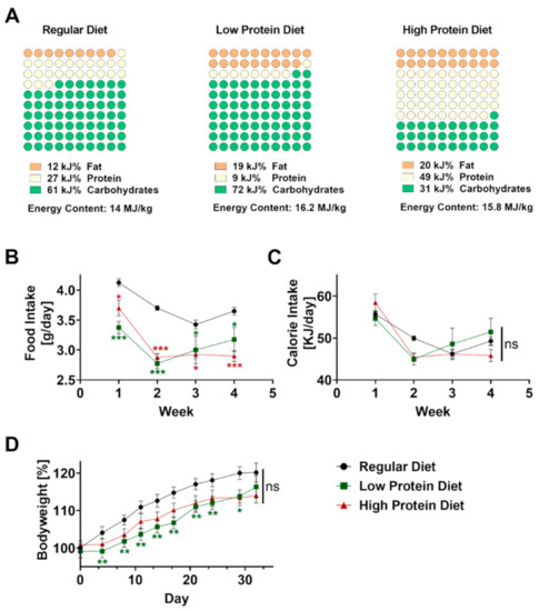 Male C57BL/6J mice were obtained from Charles Rivers (Wilmington, MA, USA) at 5 weeks of age to avoid gender-related differences. The regular, high protein, and low protein diets were obtained from ssniff Spezialdiäten GmbH (Soest, Germany, Catalogue numbers V1124-300, E15202-247, E15209-347). The regular diet contained 12 kJ% fat, 27 kJ% protein, and 61 kJ% carbohydrates (nitrogen-free-extracts 51.2%). The high protein diet contained 20 kJ% fat, 49 kJ% protein, and 31 kJ% carbohydrates (nitrogen-free extracts 29.5%). The low protein diet contained 19 kJ% fat, 9 kJ% protein, and 72 kJ% carbohydrates (nitrogen-free-extracts 69.7%). Composition of all diets is displayed in Figure 1A. The mice received a high protein, low protein or regular diet ad libitum for 4 weeks starting at the age of 5 weeks. We monitored bodyweight and food consumption twice a week. For calculating caloric uptake, the consumed food per mouse in gram was multiplied by the calories per gram of the respective type of food.