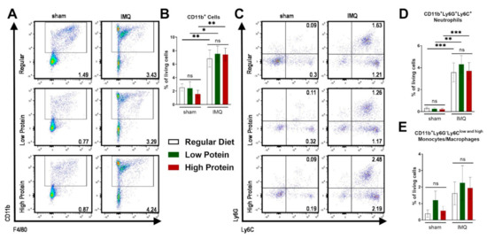 As a consequence of IMQ-treatment, we found an infiltration of myeloid cells into the skin as previously demonstrated [28]. There was no difference in the infiltration of CD11b+ myeloid cells in the skin in sham treated animals of all dietary groups (Figure 3A,B). IMQ-treatment resulted in elevated levels of dermal CD11b+ cells (Figure 3A,B) and neutrophils (CD11b+Ly6C+Ly6G+) in all groups (Figure 3C,D), whereas the percentage of skin monocyte/macrophage (CD11b+Ly6G−Ly6Clow and high) counts did not significantly increase under IMQ-treatment (Figure 3E).