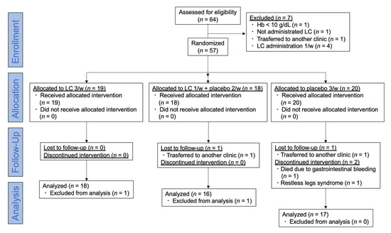 Six months after the registration period, seven patients were excluded before randomization. Among these seven patients, one had Hb levels below 10 g/dL, one did not receive LC, one was referred to another clinic, and four had been administered LC once weekly (Figure 1). The remaining 57 patients were finally included and randomly assigned using simple randomization procedures (computer-generated list of random numbers) by the clinical research coordinator (CRC). They were allocated to LC 1000 mg (5 mL) three times weekly (LC-3) (n = 19), LC 1000 mg once and placebo (saline 5 mL) twice weekly (LC-1) (n = 18), or placebo three times weekly (LC-0) (n = 20) groups (Figure 1).
