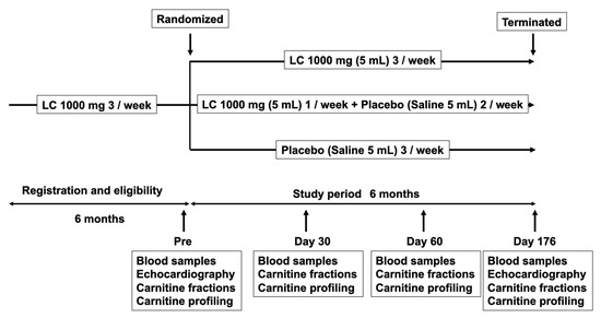 Trial design. Patients were randomized to LC 1000 mg 3/week, LC 1000 mg 1/week + placebo 2/week, and placebo 3/week groups and followed up for six months. Blood samples, including carnitine fractions and profiling, were examined before the study period, day 30, day 60, and day 176 of the study period. Echocardiography was evaluated before and on day 176 of the study period. LC: L-carnitine.