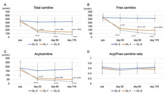 Significant decreases in the plasma total carnitine, free carnitine, and acylcarnitine levels assessed by enzyme cycling methods were observed at 30 days after reducing or stopping LC administration. In addition, all carnitine fraction levels were further reduced at 90 and 176 days in the LC-1 and LC-0 groups (p < 0.0001) (Figure 3A–C). Significant differences in plasma carnitine fraction levels between the LC-1 and LC-0 groups were similarly observed in this study (Figure 3A–C). The acyl/free carnitine ratio was not affected by the reduction or cessation of LC therapy during the study (Figure 3D).