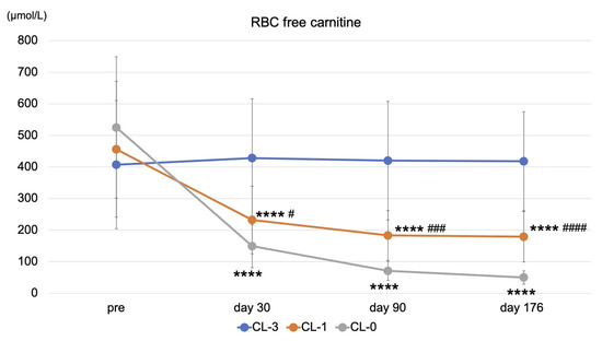 In addition, we examined free carnitine levels in RBCs, reflecting tissue carnitine levels. Free carnitine levels in RBCs were decreased in the LC-1 and LC-0 groups compared with those in the LC-3 group during the study (p < 0.0001) (Figure 4). Similarly, there was a significant difference in free carnitine levels in RBCs between the LC-1 and LC-0 groups during the study (Figure 4).