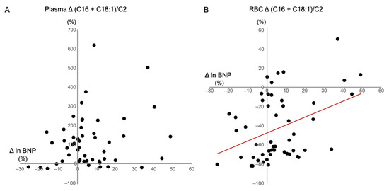 Correlation between changes in BNP with (C16 + C18:1)/C2 in (A) plasma; and (B) RBCs. BNP: B-type natriuretic peptide; RBC: red blood cell.