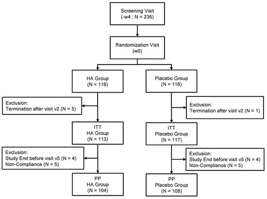 Eligible subjects included into the study were overweight (body mass index, BMI: 25–29.9 kg/m2) males and females between 18 and 65 years old, generally in good health with a stable body weight in the last 3 months prior to the study, stable concomitant medications, and, for women of childbearing age, a negative pregnancy test at first study visit as well as commitment to use contraceptive methods. Subjects with known allergy or sensitivity to any component of the investigational product were excluded from the study. Other exclusion criteria included untreated or non-stabilized thyroid gland disorder, hypertension, or type 1 or 2 diabetes, as well as gastrointestinal disorders or gastrointestinal surgery, acute chronic psychotic disorder, immunodeficiency, any other organic or systemic diseases that could influence the conduct and/or outcome of the study, history and/or presence of eating disorders, any electronic medical implant, clinically significant deviations of safety laboratory parameters at first study visit, use of medication or supplementation that could interfere with the study conduct or evaluation or diet/weight loss programs in the last month prior to the first study visit, any restrictive diet such as vegetarian or vegan, pregnancy or nursing, or a history of past or current abuse of drugs, alcohol, medication, participation in another study during the last 30 days prior to enrollment. Smoking itself was not an exclusion criterion. A total of 236 subjects gave written informed consent and were randomly assigned (see flow chart in Figure 1) to “HA” group or “Placebo (P)”, n = 118 for each group. The study protocol was approved by the Ethics Committee of Charité University Berlin and was performed according to the principles of the World Health Organization (Declaration of Helsinki), and of Good Clinical Practice (EMA/CHMP/ICH/135/1995), ICH E6 (R2). The current study has been registered on clinicaltrials.gov (https://clinicaltrials.gov/ct2/show/NCT03657186?term=Hafnia&draw=2& rank=1; (accessed on 4 September 2018)).