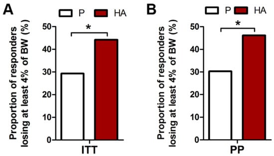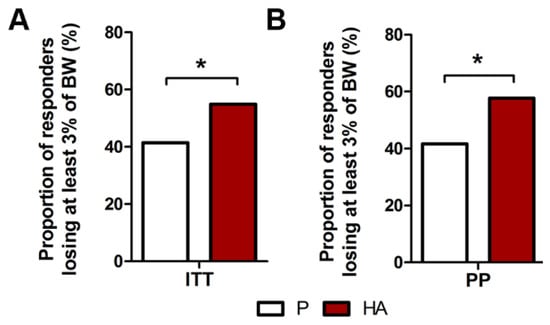 Similarly to the primary endpoint, a higher proportion of responders with at least 4% of body weight loss was found, both in ITT and PP population, in the HA (44.2% and 46.2%) compared to the P group (29.3% and 30.6%, for ITT and PP, respectively) at week 12 (p = 0.020 and 0.024, respectively), as displayed in Figure 3A,B.