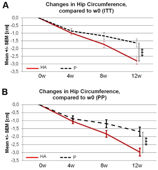 A significantly greater reduction of hip circumference at 12w was observed in the HA vs. P group in the ITT and PP population (Figure 4A,B). Waist circumference was not significantly changed in the ITT analysis while, in the PP analysis, a trend toward reduced waist circumference was observed in HA (−2.95 cm) compared to P (−2.76 cm) groups (pu = 0.10).