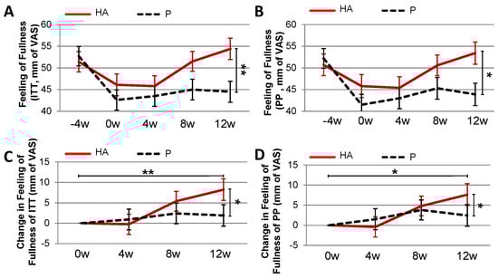 The feeling of fullness at baseline was low in both groups (Figure 5). It increased significantly at 12 w in the HA (p = 0.01) versus P group (ITT and PP analysis, Figure 5A,B). The change in feeling of fullness from baseline to 12 w (Figure 5C,D) tended also (p = 0.085) to be higher in the HA group (8.24 mm Visual Analogue Scale; VAS) compared to P group (1.92 mm VAS). There were no differences between the groups for the feelings of satiety and craving (data not shown).