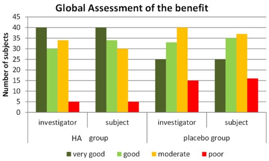In the HA group, benefit of treatment (Figure 6) was rated as “very good” or “good” by 67.9% of subjects compared to 53.1% of subjects in the placebo group (pU = 0.019). The blinded investigators rated the benefit as “very good” or “good” for 64.2% of subjects in the HA group compared to 51.3% of subjects in the placebo group (pU = 0.035). Rating was “poor” by 5% of the HA subjects versus 14.2% of the P group. Tolerability was assessed by subjects and investigators as “very good/good” in 98.2% of cases in both groups (1.8% ratings were “moderate”).