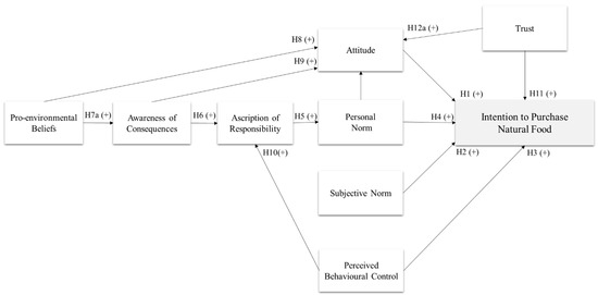In the present study, we aimed to predict consumers’ intention to buy natural food by evaluating the predictiveness of both rational and moral considerations. Therefore, we tested the integration of TPB and VBN theories, also including a measure of trust in the natural food supply chain. Our hypotheses are described below and illustrated in Figure 1.