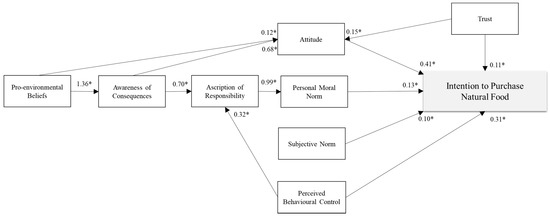 The present study proposes and tests a psychosocial model to explain consumers’ intentions to purchase natural food products. The model integrates the TPB and the VBN theoretical frameworks. The TPB model has been selected to capture motives related to consumers’ decision-making process, such as positive or negative evaluations towards buying natural food and perceptions of having enough financial resources to purchase it. The VBN model has been selected to consider consumers’ pro-environmental motives, such as the moral feeling of purchasing natural food to protect the environment. In this integrated model, we also add the dimension of trust in the natural food supply chain. Most consumers are concerned about pesticides, food additives, and processed food and consumers expect institutions, food processing industries and retailers to take responsibility for food safety. Trusting these actors can therefore reduce feelings of uncertainty [88].
