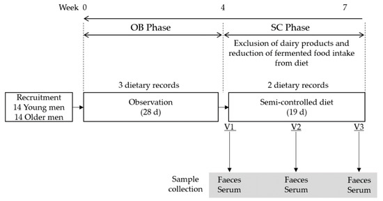 Overview of study design. A total of 14 healthy young adult men (YA) and 14 older adult men (OA) participated in a 28-day observation phase (OB phase) with 3 dietary records conducted at intervals of 9 ± 4 days. The semi-controlled diet phase (SC phase) excluded dairy product intake and reduced fermented food intake for 19 days in a free-living condition. During the SC phase, fasting serum samples were collected on three visits (V1 on day 1, V2 on day 8–14, V3 on day 19 of intervention). Faecal samples were collected either a day before each visit or on the morning of the visit.
