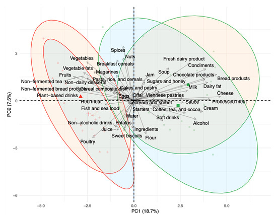 Biplot of principal component analysis (PCA) with a loading plot of daily intake of total food groups for the young adults (YA) and older adults (OA) groups during the observation (OB) and semi-controlled diet (SC) phases. Symbols define the group and period: circles OA, OB phase; squares YA, OB phase; triangles OA, SC phase; crosses YA, SC phase. Ellipse outline represents the period: OB phase in green, SC in red. Ellipse fill represents the group: OA group, orange; YA group, blue. PC, principal component.