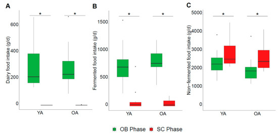 Overview of dietary modifications during the SC phase. (A–C): daily intake of dairy products, fermented foods, non-fermented foods respectively; OB phase in green, SC phase in red. * Significant difference between the OB and SC phases (diet effect, p-value < 0.05) by paired Wilcoxon signed-rank test.