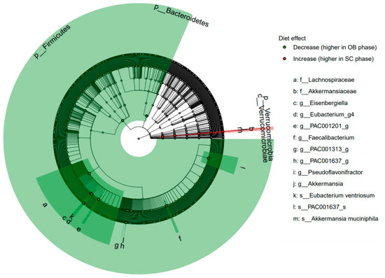 Cladogram for all subjects and 17 taxa showing significant microbiota changes between the observation (OB) and semi-controlled diet (SC) phases (relative increases in the SC phase in red, decreases in green). Bacteria that show a significant change (FDR < 0.05) are highlighted with a node circle and labelled with text and clade. Taxonomic level indicated by letter preceding the bacterial descriptor from genus, ‘s_’ to phyla, ‘p_’.