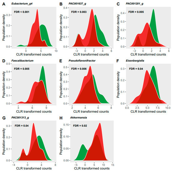 Significant changes in the relative abundance of eight genera (A–H) in response to the semi-controlled diet. X axis is the relative abundance of the bacterium given in centred log-ratio (CLR) transformed counts and Y axis is the prevalence of participants. The sample distribution of the observation phase is illustrated in green and of the semi-controlled diet phase in red.