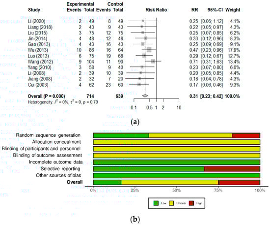 The probiotic formulation used as adjuvant reduced the relative risk of unresolved diarrhea. (a) Forest plot of studies with an efficacy outcome (effective rate) for diarrhea of various etiologies. Events refers to the number of cases categorized as inefficient (unresolved diarrhea); Total refers to the number of participants in the Experimental (Probiotic) and Control groups. The 12 studies included in the meta-analysis are detailed in Table 2. (References: Cui, 2003 [], Li, 2008 [], Jiang, 2008 [], Yang, 2010 [], Wang, 2012 [], Luo, 2013 [], Gao, 2013 [], Wu, 2013 [], Jin, 2014 [], Liu, 2015 [], Liang, 2018 [], Li, 2020 []). (b) Mosaic plot showing the risk of bias summary of the studies included in the meta-analysis.