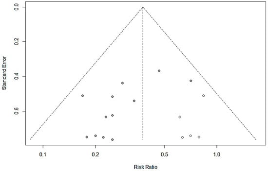 For the risk of bias analysis (Figure 2b), most studies included in the meta-analysis were categorized as low or unclear risk [,,,,,,,,], with three studies classified as high risk of bias due to potential randomization or selective reporting issues [,,]. All studies were classified as unclear risk for the allocation concealment and blinding-related domains; a similar trend was observed in a previous systematic review, which could reflect regional publication practices []. Publication bias was assessed using the funnel plot method (Figure 3) and asymmetry was found significant (Egger’s regression test; t = −2.84, df = 10, p = 0.0176), suggesting the potential occurrence of publication bias. The number of missing studies to correct the asymmetry was estimated to five using the Trim and Fill method by Duval and Tweedie [,]. Upon inclusion of 5 negative studies in the meta-analysis (empty circles; total studies = 17), the result remained significant with the reduction in the risk of unresolved diarrhea changing from 69% to 62.5% (RR 0.3753 [0.2867; 0.4913]; p < 0.0001).