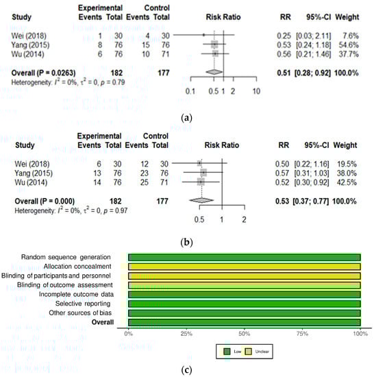 To compare these studies, ineffective cases were used to calculate the RR of treatment failure in the absence of probiotic (Figure 4a). When combining all three studies to increase the number of participants, the probiotic significantly reduced the risk of unresolved anemia by 49% (RR 0.51 [0.28–0.92]; p = 0.0263). Considering the high efficiency of iron dextran supplementation on its own, improvement of treatment efficacy with the probiotic (i.e., promoting iron absorption) is considered clinically meaningful. Furthermore, the common adverse effects of iron dextran supplementation, namely GI symptoms (diarrhea or constipation), nausea, and metal taste, were monitored in all 3 studies and found consistently reduced with the probiotic (Figure 4b), with a 47% reduction in the risk of side effects (RR 0.53 [0.37–0.77]; p = 0.0009) [,,]. All three studies were found at low risk of bias (Figure 4c), except for the domains related to blinding which are typically not reported possibly due to regional reporting practices, as observed previously [].