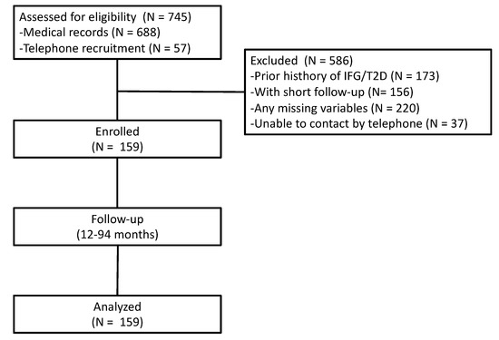 - de Vegt, F.; Dekker, J.M.; Jager, A.; Hienkens, E.; Kostense, P.J.; Stehouwer, C.D.; Nijpels, G.; Bouter, L.M.; Heine, R.J. Relation of Impaired Fasting and Postload Glucose with Incident Type 2 Diabetes in a Dutch Population: The Hoorn Study. J. Am. Med. Assoc. 2001, 285, 2109–2113. [Google Scholar] [CrossRef]