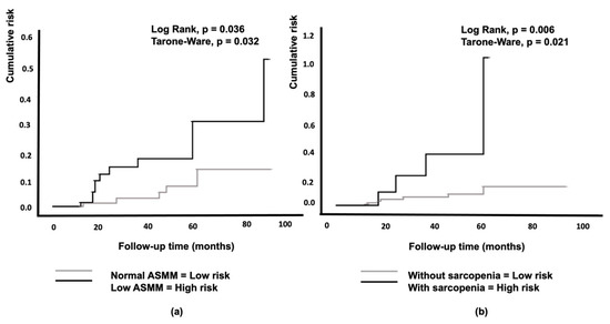 The Kaplan–Meier curves showed that low ASMM was associated with a significantly higher probability of developing IFG/T2D over a period of 94 months compared to normal ASMM conditions (Figure 2a).