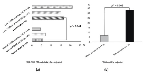 Figure 3a shows that participants with a low ASMM had a higher IFG/T2D incidence than those in the normal ASMM group (17% vs. 6%), which was independent of FM, BMI, WC, and dietary fats (adjusted p = 0.044).
