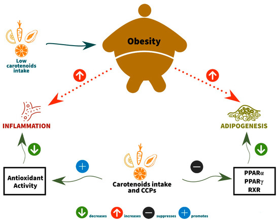 According to Coronel et al. [30], vitamin A, similar to the hormones with pleiotropic effects in mammals, is an important adipose tissue development regulator and plays an essential role in obesity. These researchers described that individuals with obesity had reduced plasma β-carotene concentrations through the data obtained compared to eutrophic individuals. In addition, inflammation caused by oxidative stress is present in the nutritional status of obesity. Consequently, adipocyte differentiation and oxidative stress are targets for carotenoid action (Figure 1).