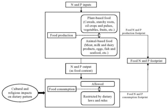 A ‘footprint’ is a parameter for the quantitative valuation of the pressure imposed on environmental resources by human beings. To effectively manage N and P along the food supply chain, it is necessary to assess the national food footprint based on the production and consumption of food items. The N footprint explains anthropogenic N loss [8], while the P footprint includes both the P resource requirement and P loss to the environment [9,10]. The N use efficiency (NUE) or P use efficiency (PUE) in food is determined by assessing how much of the N/P input reaches the final output, the food product. The N footprint is commonly determined by a country-specific bottom-up approach, known as the N-Calculator (e.g., [2,8,11,12,13]). In the case of the P footprint, the most commonly used method for country-based analysis is the material flow analysis [14,15,16,17,18]. To develop a detailed scenario of national food N and P footprints, similar system boundaries, datasets, and time periods were applied to the N-Calculator and the P-Calculator approaches [2]. While the existing N-Calculator and P-Calculator methods are based on the average per capita consumption of a set of given food items, since the consumption of many food items is subject to religious laws and rules, it is assumed that the consumption of individual food items differs considerably among religious communities.