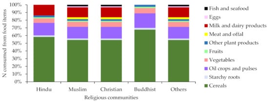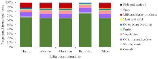 The dietary laws and rules of each of the four religions were considered to categorize the food habits of followers of those religions. Since only plant-based and dairy products are allowed in the Hindu faith, Hindus were regarded as lacto-vegetarians. Since Buddhism restricts the diet of its followers to plant-based products, Buddhists were classified as vegetarians. Both Muslims and Christians were classified as non-vegetarians since there are no category-wide food restrictions in these religions. Pork is strictly prohibited in Islam, and alcohol is forbidden in Hinduism, Islam and Buddhism. We categorized the food items on an FAO Food Balance Sheet [22] (Tables S1 and S2) according to the N and P intake from food by the religious groups in 2013 following dietary restrictions [20,24].