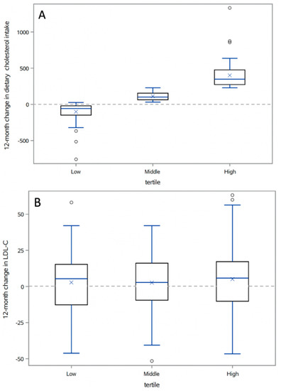 (A) Box plots of 12-month changes in dietary cholesterol intake by tertile of 12-month change in dietary cholesterol for healthy low-carb (HLC). Boxes represent interquartile range (IQR); center line in box is median, “X” within the box is the mean; upper and lower tails are 1.5X IQR. (B) Box plots of 12-month changes in LDL cholesterol intake by tertile of 12-month change in low-density lipoprotein (LDL) cholesterol for healthy low-carb (HLC). Boxes represent interquartile range (IQR); center line in box is median, “X” within the box is the mean; upper and lower tails are 1.5X IQR.