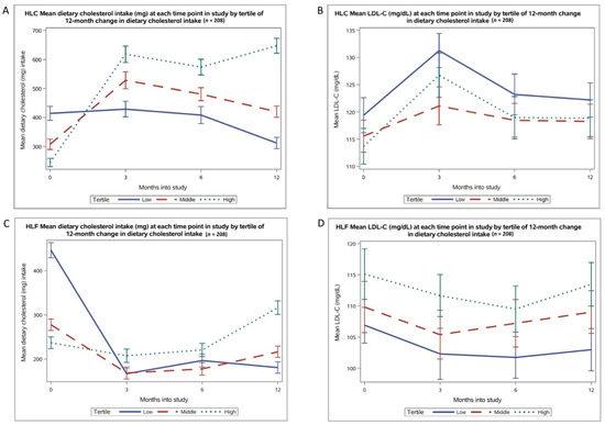 Participants reported consuming a mean of 322 ± 173 (SD) mg of dietary cholesterol per day at baseline, with 103 participants (~50%) reporting consuming >300 mg/day. The following characteristics were not significantly different among the tertiles of 12-month change in dietary cholesterol intake: age, sex, race, education, baseline weight, and plasma lipids (Table 1). Baseline levels of cholesterol intake were not significantly different between the tertiles. Baseline carbohydrate intake was similar among the tertiles (p = 0.18). There were inverse relationships between 12-month change in dietary cholesterol intake and baseline levels of cholesterol (mg), total fat (g), saturated fat (g), protein (g), and calories (kcal; all p < 0.01). At baseline, the lowest, middle, and highest tertiles of 12-month dietary cholesterol change consumed 414 ± 200, 307 ± 148, and 245 ± 120 mg/day (mean ± SD), respectively (Table 1). Baseline diet and demographic data for the HLF arm are shown in Table A2.