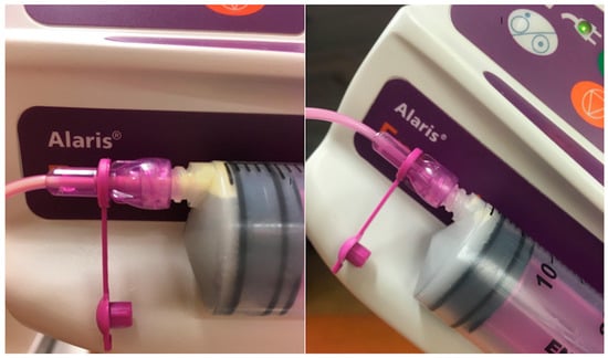Each modality was tested a total of nine times with a continuous administration of BM at a flow rate of 4 mL/h for approximately four hours. The flow rate was calculated in accordance with local clinical protocol based on a 600 g infant (recommended daily intake is 150–170 mL/kg/day). The duration of four hours per test run was used based on local clinical protocol that feeding syringes are to be changed every four hours. To deliver 16 mL, there is a need for some overage. It was noted that, repeatedly, 2–3 mL was left in the syringe with a visibly high fat content, possibly as a strategic limitation of the pump to avoid delivering air in the tubing and true to the clinical setting. Of the 16 mL initially aspirated into the syringe, about 3 mL is needed to fill the extension tubing. Normal clinical practice dictates that the syringe be filled with an extra 3 mL for the first feeding to fill the extension tubing and ensure the right amount of BM is delivered. This was not done, as the BM supply was limited.