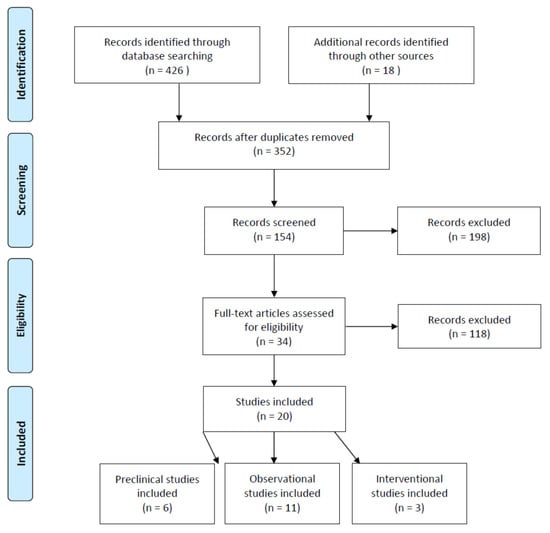 In total, 426 studies were identified during the initial search from scientific databases. After duplicate records were removed and additional records were retrieved from reference lists, 352 studies remained for title and abstract screening. From these 352 studies, 198 records were excluded based on article type. Consequently, 118 records were excluded due to the aforementioned inclusion criteria for preclinical and clinical studies, and 34 studies were identified to be eligible for full-text assessment. Finally, 14 records were excluded because of the methodology used, with a resulting 20 studies included in the final review. Of the 20 studies analyzed, six were preclinical studies [46,47,48,49,50,51], eleven were observational clinical studies [54,55,56,57,58,59,153,154,155,156,157], and three were randomized controlled trials [60,61,62] (Figure 2).