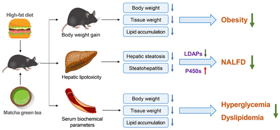 Zhou, J.; Yu, Y.; Ding, L.; Xu, P.; Wang, Y. Matcha Green Tea Alleviates Non-Alcoholic Fatty Liver Disease in High-Fat Diet-Induced Obese Mice by Regulating Lipid Metabolism and Inflammatory Responses. Nutrients 2021, 13, 1950. https://doi.org/10.3390/nu13061950