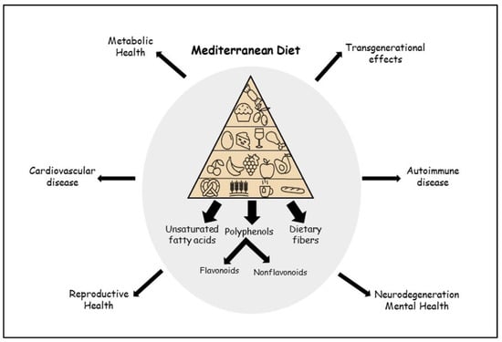 It has been established, worldwide, that non-communicable diseases such as obesity, diabetes, metabolic syndrome, and cardiovascular events account for a high percentage of morbidity and mortality in contemporary societies. Several modifiable risk factors, such as sedentary activities, sleep deprivation, smoking, and unhealthy dietary habits have contributed to this increase. Healthy nutrition in terms of adherence to the Mediterranean diet (MD), rich in fruits, legumes, vegetables, olive oil, herbs, spices, and high fiber intake may contribute to the decrease in this pandemic. The beneficial effects of the MD can be mainly attributed to its numerous components rich in anti-inflammatory and antioxidant properties. Moreover, the MD may further contribute to the improvement of reproductive health, modify the risk for neurodegenerative diseases, and protect against depression and psychosocial maladjustment. There is also evidence highlighting the impact of healthy nutrition in female people on the composition of the gut microbiota and future metabolic and overall health of their offspring. It is therefore important to highlight the beneficial effects of the MD on metabolic, reproductive, and mental health, while shaping the overall health of future generations. The beneficial effects of MD can be further enhanced by increased physical activity in the context of a well-balanced healthy lifestyle.