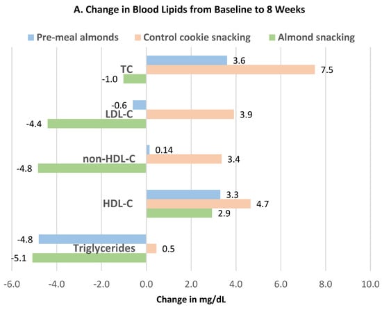 Liu et al. [42], in a parallel RCT, randomized 169 healthy individuals (54% women, mean age 26 years, mean BMI 23) to the usual diet with: (1) 18.5 g almonds before each meal (pre-meal), (2) 56 g almonds as a snack consumed between meals, or (3) an isocaloric cookie (control) consumed between meals for 8–16 weeks. There were no significant differences in body mass or BMI from baseline among the three groups. The effects of almond and cookie intake on body fat measures for both 8 and 16 weeks are summarized in Figure 10A,B. Pre-meal intake of almonds significantly reduced body fat mass (p = 0.025) and visceral fat mass (p = 0.000) at both 8 and 16 weeks and BF (%) after 16 weeks (p = 0.032) compared to the cookie control. Snacking on almonds significantly reduced body fat (%) compared to the cookie control after 16 weeks (p = 0.032) without significantly changing total body mass or BMI.