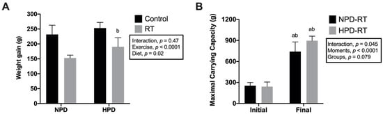 Importantly, weight gain was significantly lower in resistance-trained groups compared with their controls (p < 0.0001, Figure 1A). Although the animals increased strength over the 12 weeks of RT (p < 0.05), no differences were observed between the maximum strength between the trained groups (NPD-RT vs. HPD-RT) after 12 weeks of RT (Fexercise (1, 16) = 3.501, p = 0.08) (Figure 1B).