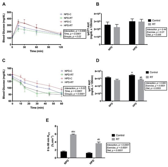 Two-way ANOVA demonstrated an interaction between groups and time for ipGTT (Finteraction (12, 64) = 2.670, p = 0.006). Regarding the groups and ipGTT, the NPD-RT group showed differences in relation to HPD-C (p = 0.02) and HPD-RT (p = 0.008) at the 15th minute (Figure 2A). After the ipGTT, glucose kinetics revealed that only the NPD-RT group showed a reduction in AUC compared with high-protein groups (NPD-RT vs. HPD-C p = 0.03 and vs. HPD-RT, p = 0.04) (Figure 2B). Concerning the insulin tolerance test, a significant interaction was identified (Finteraction (15, 96) = 2.104, p = 0.0158). Accordingly, the HPD-RT group showed differences between all-time points with its HPD-C control (Figure 2C, p < 0.05). RT decreased AUCglu for NPD-RT and HPD-RT when compared with the control groups during the iTT (Figure 2D, Finteraction (1, 16) = 10.56, p = 0.005). Further, the KITT (0 to 60 min) showed a significant increase in glucose clearance in the trained groups (NPD-RT, 5.88 ± 0.11%/min, HPD-RT, 3.70 ± 0.3%/min) compared with the controls (NPD-C, 1.61 ± 0.13%/min, HPD-C, 1.25 ± 0.12%/min). However, HPD-RT (3.70 ± 0.3%/min) differed from NPD-RT (5.88 ± 0.11%/min) (p < 0.0001) (Figure 2E, Finteraction (1, 12) = 98.22, p < 0.0001.