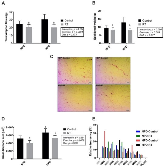 3.4. Effects of HPD Diet and RT on Adipose Tissue Weight and Adipocyte Size