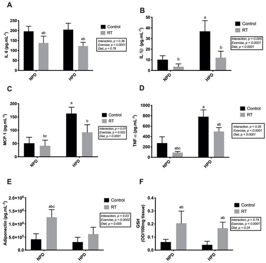 Inflammatory responses of epidydimal adipose tissue after 12 weeks of the experiment. (A) IL-6; (B) IL1-β; (C) MCP-1; (D) TNF-α; (E) adiponectin; (F) GSH. Values are presented as means ± SD. a p < 0.05 vs. NPD-Control, b p < 0.05 vs. HPD-Control, and c p < 0.05 vs. HPD-RT.
