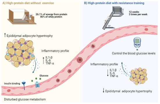 Overview of the effects of high-protein diet and resistance training on glucose control, adipocyte size, and epididymal adipose inflammatory biomarkers in rats. (A) High-protein diet without exercise induced epididymal adipocyte hypertrophy and increased TNF-α, MCP-1, and IL1-β levels, which combined may have contributed to disturbed glucose metabolism; (B) Resistance exercise training compensated the detrimental effects of high-protein diet by reducing epididymal adipocyte hypertrophy, local inflammation, and glucose blood levels. The figure was created in the Biorender web-based software.