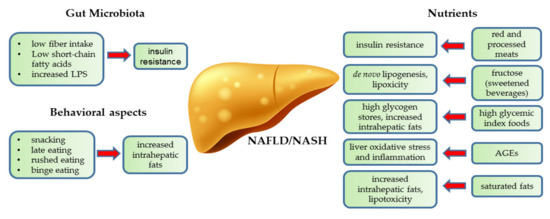 For instance, in one cross-sectional study conducted on 789 individuals undergoing screening colonoscopy, the consumption of red and processed meat was associated with both NAFLD and insulin resistance [64]. Similarly, a high amount of fructose or high glycemic index foods lead to enhanced hepatic fat synthesis, while a high intake of saturated fats predisposes the liver to fat accumulation. The subsequent lipid-driven toxic damage represents the main driver of hepatic insulin resistance that arises along with NAFLD. Exogenous and endogenous advanced glycation end-products (AGEs) represent a further source of oxidative stress that might interfere with hepatic glucose metabolism in the onset of liver inflammation. Likewise, low fiber intake negatively shapes intestinal bacterial species to dysbiosis, increasing proinflammatory bacterial products that directly impact on liver metabolism.