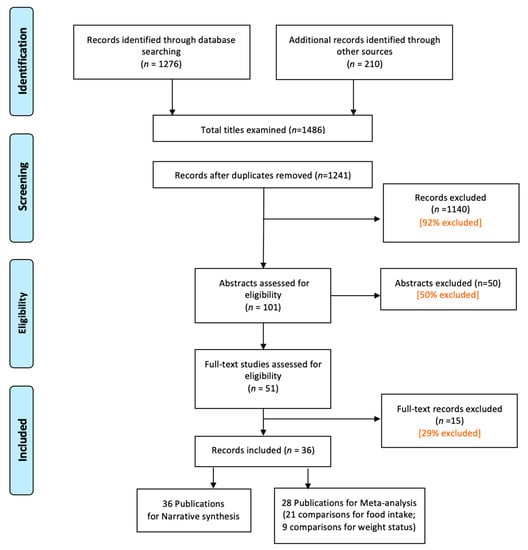 A total of 1486 titles were identified (1276 through database searching and 210 from other sources). After removing duplicates, 1241 records were retained. Of these, 101 abstracts were assessed for eligibility, and 51 full-text articles were retrieved, resulting in a final sample of 36 eligible publications for the narrative synthesis. Of these, 28 publications were included in the meta-analysis (Figure 1).