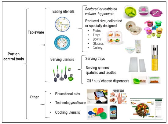 Taxonomy of available portion control tools (compiled by the authors from various sources; see text and Supplementary Table S1). Pictures of calibrated tableware, portion control pots and hands poster kindly shared by Precise Portions NLS [], TheDietPlate.com [], GreatIdeasInNutrition.com [], Rosemary Conley En-terprises [] and Flexible Dieting Lifestyles LLC [] respectively. Picture of ServAR tablet application from []. We have sought to obtain permission to reproduce published images from all providers.