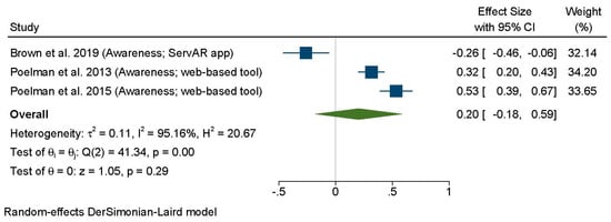 Only three of the seven articles provided sufficient data to be included in the meta-analysis (Figure 3). This revealed that interventions using web-based or mobile applications did not have a significant impact on portion size awareness. Although some individual studies showed promising results for web-based tools, the overall effect size was small, and heterogeneity across studies was high (d: 0.20; 95% CI: –0.18, 0.59; I2 = 95.16%).