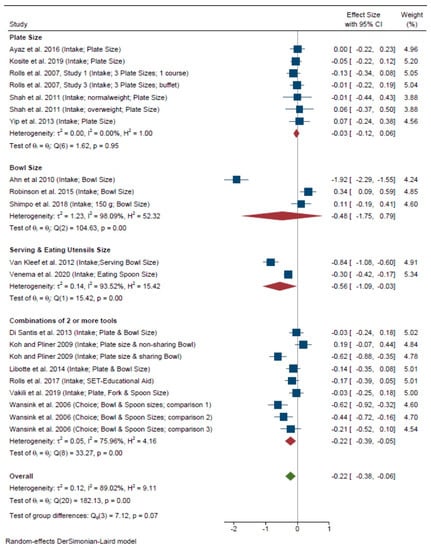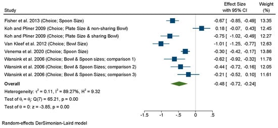 Sensitivity analyses showed no overall impact of awareness of study purpose (test for group differences χ2(2) = 1.20, p = 0.55) or strategy, that is, employing only the tool vs. using the tool alongside another strategy (χ2(1) = 0.82, p = 0.36). Removing the study from Cornell University [] did not change the results in either case (Supplementary Figures S2–S5). Replacing the small rice PS (150 g) in Shimpo and Akamatsu 2018 [] with the large PS (250 g) did not change the results (Supplementary Figure S6).
