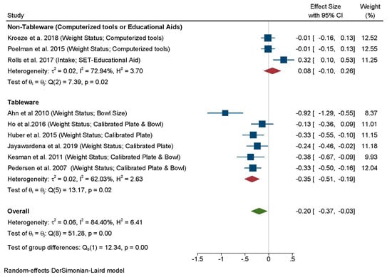 All nine studies reporting weight status variables were included in the MA (Figure 6). The combined analysis showed a marginal impact on weight status (measured as body weight or BMI change), across all tools (d = –0.20; 95% CI: –0.37, –0.03; I2 = 84.40%). A test for group differences revealed a significant effect of tool type (χ2(1) = 12.34; p 0.01). In particular, four studies using calibrated plates [,,,] and one study using smaller bowls [] were associated with reductions in body mass (BMI and body weight) with a medium effect size (d = –0.35; 95% CI: –0.51, –0.19; I2 = 62.03%, 6 comparisons including a calibrated set used in adolescents which failed to reach significance []). No impact was observed for computerized tools and the set of tools from one long-term RCT [].