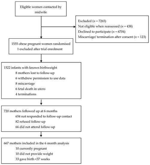 29. Patel, N.; Godfrey, K.; Pasupathy, D.; Levin, J.; Flynn, A.; Hayes, L.; Briley, A.; Bell, R.; Lawlor, D.; Oteng-Ntim, E. Infant Adiposity Following a Randomised Controlled Trial of a Behavioural Intervention in Obese Pregnancy. Int. J. Obes. 2017, 41, 1018–1026. [Google Scholar] [CrossRef]