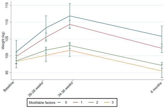 Figure 2. Mean weight from baseline to 6 months postpartum for women with zero, one, two, or three modifiable factors associated with negative PPWR. Notes: baseline = 15–18 weeks’ gestation, 6 months = 6 months postpartum. Factors include GWG ≤ 9 kg, breastfeeding ≥ 4 months, and moderate to high levels of physical activity in the postpartum.