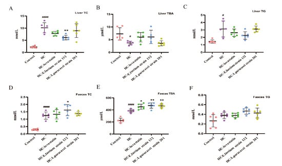 The liver TC and TG values in the HC group (TC: 9.98 ± 2.35 mmol L−1) were significantly higher than those in the control group (TC: 2.24 ± 0.38 mmol L−1; p < 0.05). Liver TC levels in the HC-E. faecium strain 132 (6.12 ± 0.93 mmol L−1) group were significantly decreased compared to those in the HC group (p < 0.05), and the values were similar to those in the control group (Figure 1A). Liver TBA levels increased but liver TG levels decreased in the other groups compared to those in the HC group (Figure 1B,C). Fecal TC increased in the HC-E. faecium strain 132 group compared with that in the HC group (p < 0.05; Figure 1D). A significant increase in fecal TBA content was observed in the HC-lovastatin (452.28 ± 42.75 μmol L−1), HC-E. faecium strain 132 (472.71 ± 45.48 μmol L−1) and HC-L. paracasei strain 201 (466.51 ± 31.06 μmol L−1) groups compared to that in the HC group (401.93 ± 49.86 μmol L−1; p < 0.05; Figure 1E). Fecal TG was similar among all rats (Figure 1F).